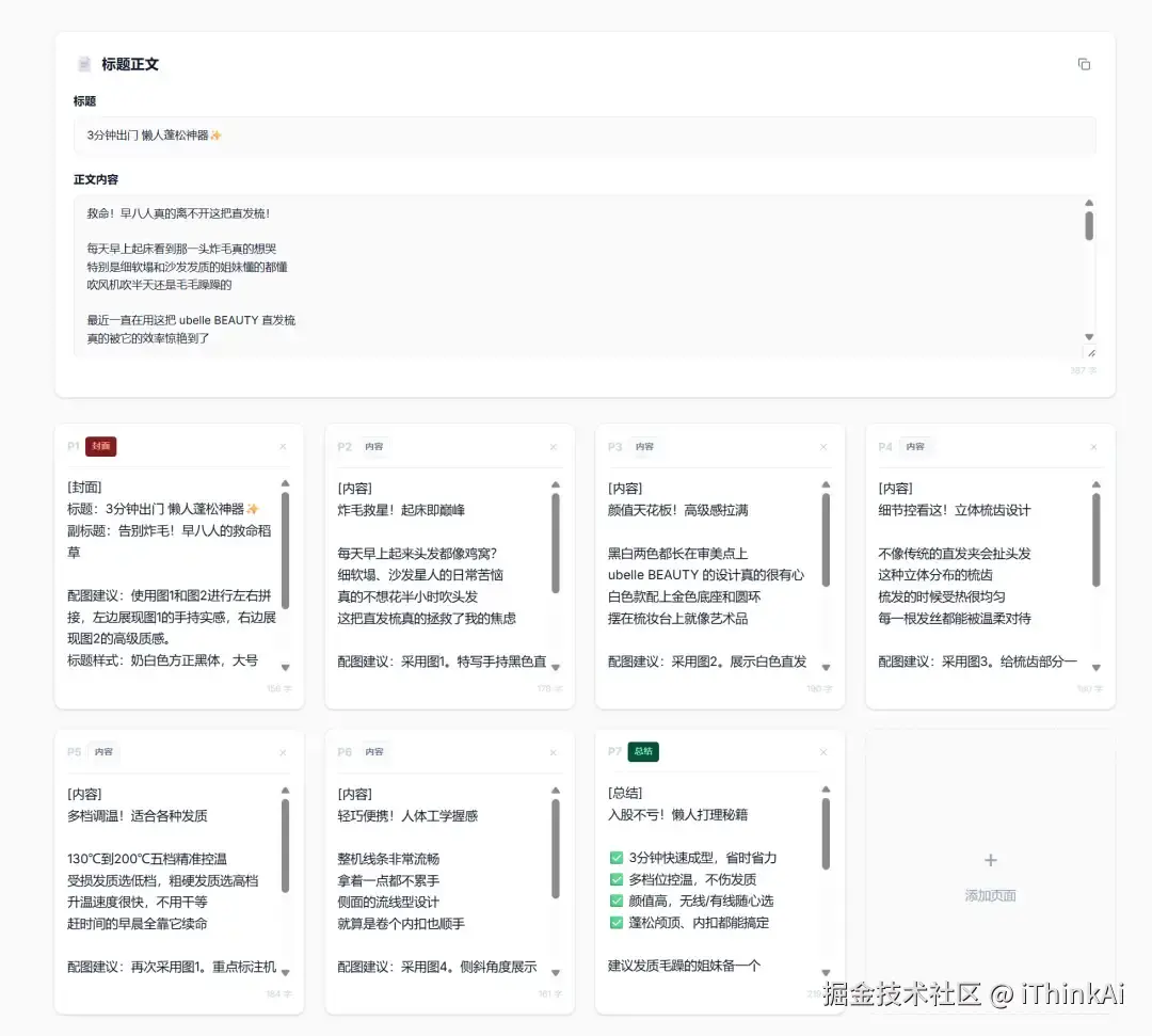 第二步:生成对应的标题、正文以及每一张图的图片描述。它会自动帮你把 9 宫格的每一张图要放什么文字、配什么背景都规划好,你甚至可以直接在上面微调。