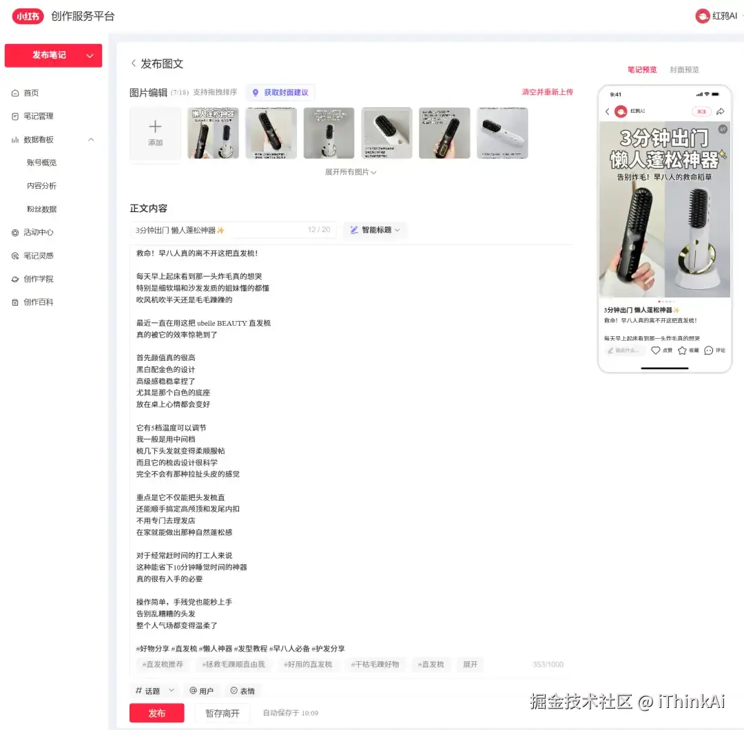 第四步:支持手机端、浏览器一键发布。预览没问题后,直接保存发小红书。这种效率,一个人打理 10 个号都不成问题。