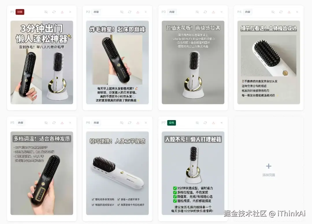 第三步:根据生成的描述,依次批量生成所需的图片素材。AI 会开始干活,几分钟时间,一套风格高度统一的图片就出来了。
