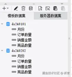 **关联数据集:**帆软报表中提供了关联数据集功能,先根据不同月份建立多个数据集: