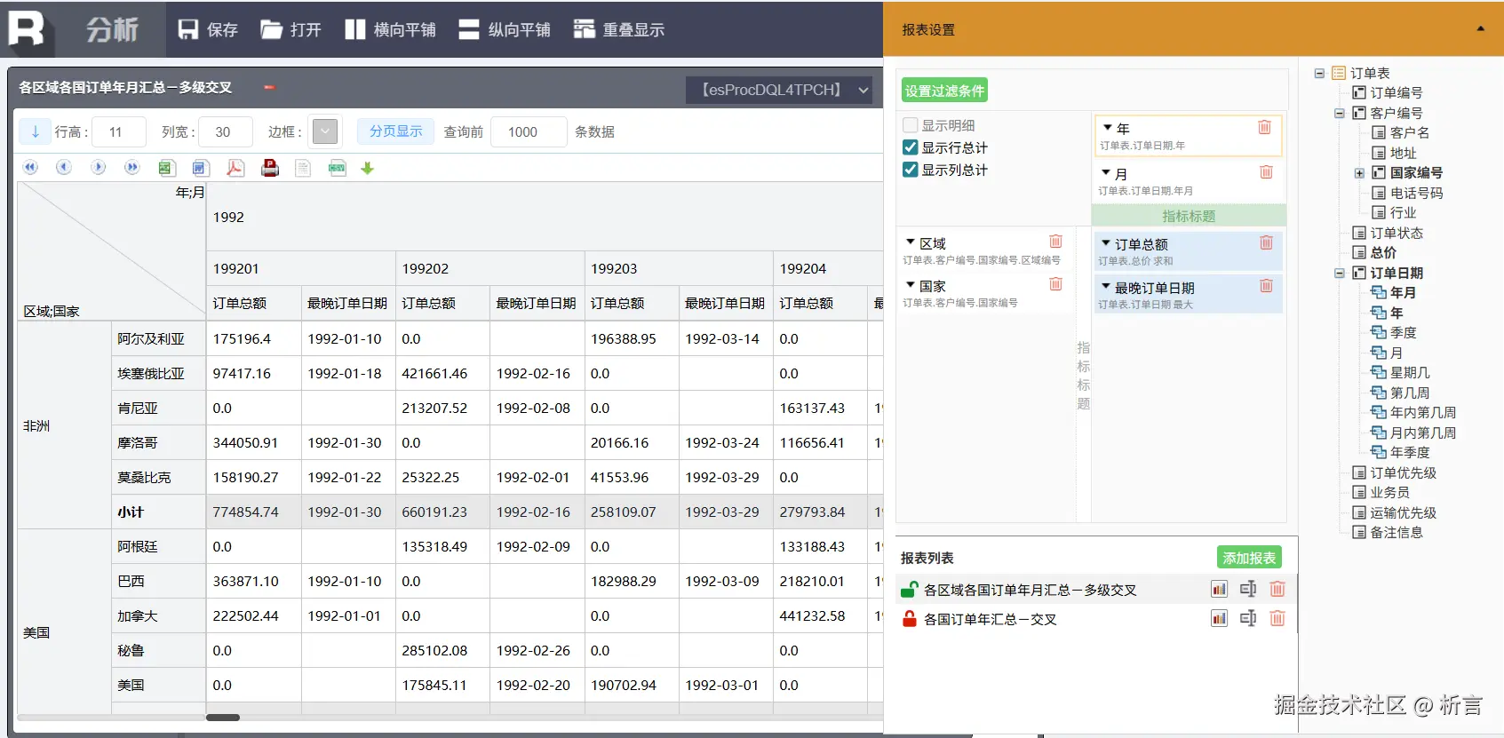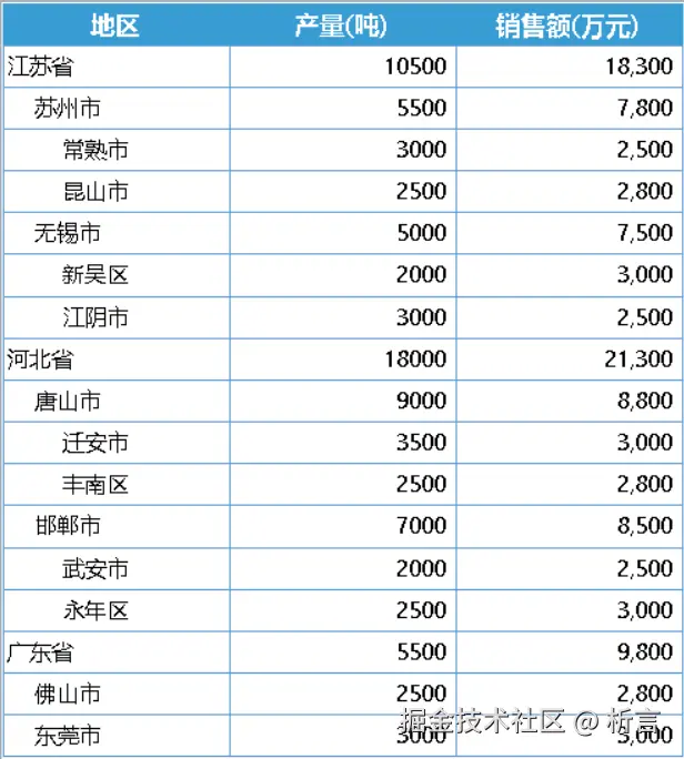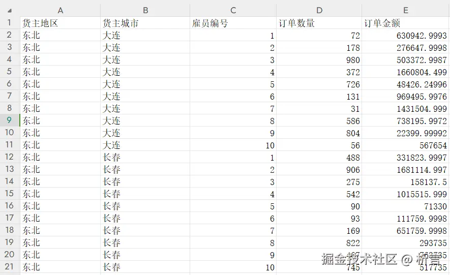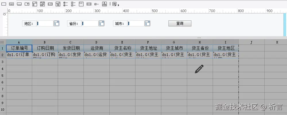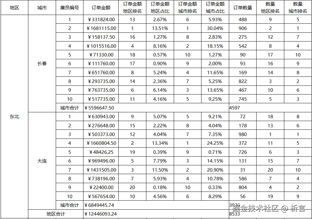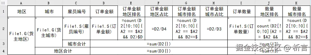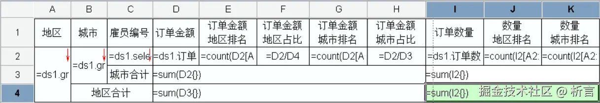 要求按照地区、城市维度汇总数据,并计算订单金额、订单数量的占比及排名情况。这是一个典型的跨行组计算的报表,主要考察报表的格间计算能力,模版如下: