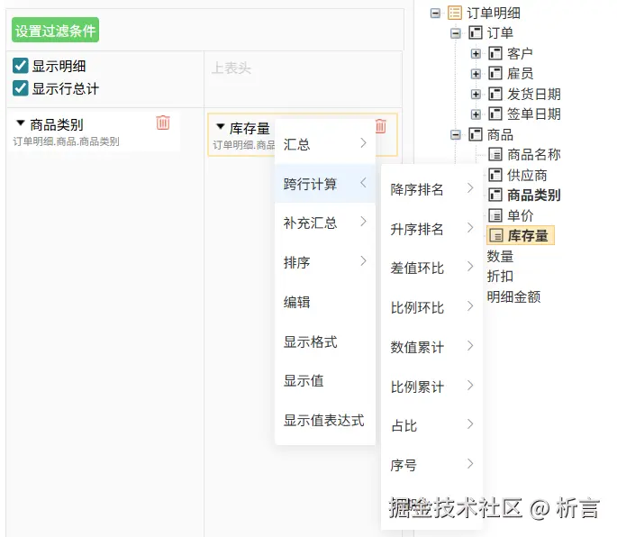 页面端字段拖拽、切片、切换、下钻等都有提供,也可以对汇总数据进行跨行运算: