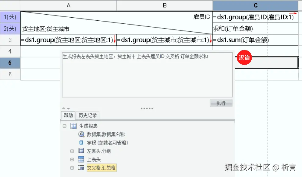 润乾报表最新版中增加了汉语报表功能,可以通过一系列汉语命令协助完成报表数据集、单元格公式、样式等设置,降低报表开发难度,如:通过一句汉语指令就可以协助生成一个多层交叉扩展报表: