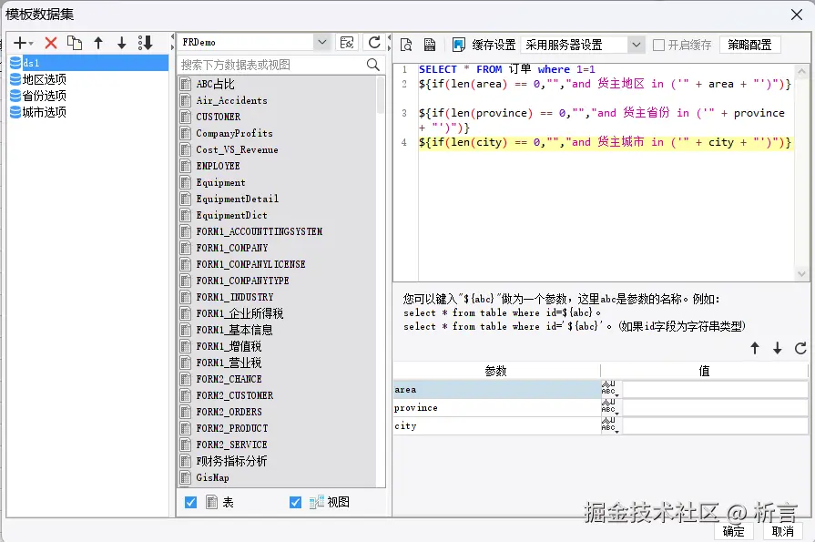 SQL 语句采用拼接方式,可以写入帆软自己的表达式,这里实现了如果参数长度为 0,就忽略这个参数取所有值功能,写起来略有复杂,对开发人员有一定技术上的要求了。