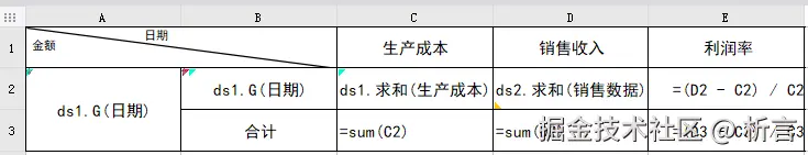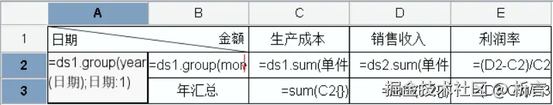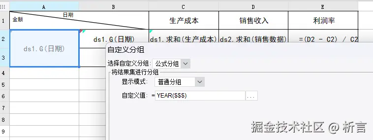 按年分组中,数据库中存储的是日期数据,将日期字段拖拽到A2 单元格,在单元格直接使用 year 函数取年,生产表中单件成本和生产件数是两个字段,要通过这两个字段算出生产成本,C3 单元格公式 =ds1.sum(单件成本 * 生产件数),表达式对数据汇总时,可以先对字段做运算、再汇总。两个数据集间关联通过函数过滤来控制,D2 单元格中表达式 =ds2.sum(单件售价 * 销售件数,year( 日期)==A2 and month(日期)==B2),增加了日期的过滤,这里的过滤条件要手动输入。单元格的汇总、计算比例这些按照 Excel 的基本操作设置就可以,有一点说明下,C3 中对 C2 做汇总,D3 中可以将 C3 的公式复制过来,单元格的引用自动变化,这也是和 Excel 高度保持一致的地方。