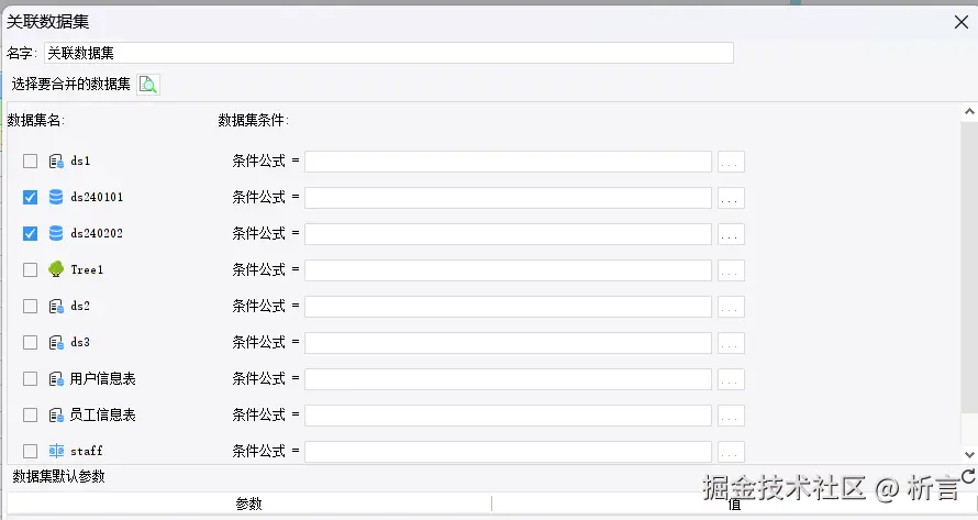 然后新增关联数据集,通过向导方式将两个数据集合并在一起: