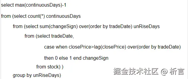 值得关注的是,润乾增加了独立的计算引擎SPL,也就是脚本数据集,能够将复杂的数据获取、转换与计算过程从报表模板中剥离出来,实现了计算逻辑的前置。在数据集功能点对比时,看到脚本数据集结合了 SQL 的集合处理能力与 Java 的过程控制优势,并配备了可视化调试工具,使得开发人员可以像调试程序一样分步跟踪数据执行结果,这大大提升了复杂数据准备的开发效率和问题排查能力。这种“强数据准备、轻单元格计算”的架构,不仅降低了报表模板本身的复杂度,也使报表引擎能更专注于渲染和展示,从而在整体上提升了报表的性能与可维护性。如需要查看“某支股票最长连续涨了多少交易日”时,通过 SQL 去实现需要多行语句: