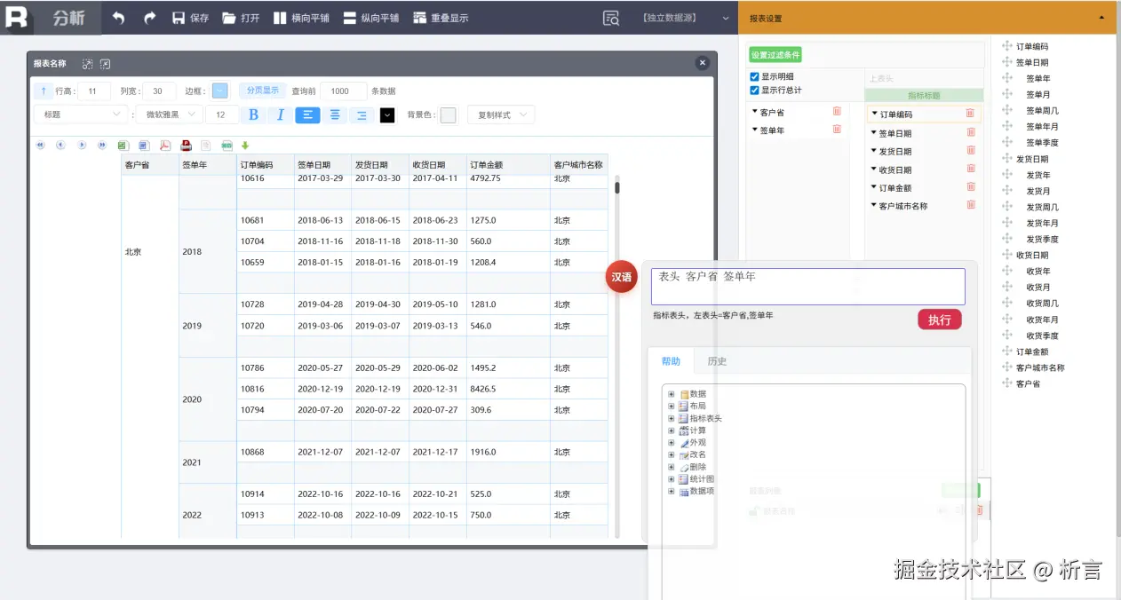 查询后的结果数据,可以快速进入分析页面,实现查询数据的图、表展示与汇总分析,并提供了汉语言报表功能,通过汉语言灵活做数据分析: