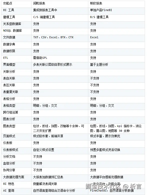**小结:**润乾BI 与 FineBI 定位迥异:润乾 BI 的核心是其独创的 DQL 模型,擅长将复杂多表关联(如自关联、环状关联)封装为可拖拽的业务语义,前端开源,适合在复杂业务场景(如 ERP、供应链)中定制集成;而 FineBI 定位企业级一站式分析平台,以直观拖拽降低使用门槛,提供从数据准备到协作分享的完整闭环,更适合快速构建面向全员的自助分析体系。