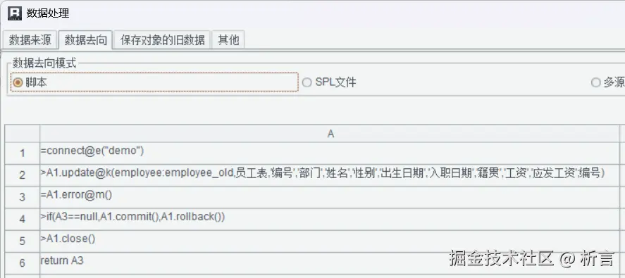润乾填报功能的侧重点在于数据提取、业务处理及向数据库提交时的业务控制。它采用一个独立填报模型,无法由现有的查询报表直接转换而来,需要重新设计一套专门的填报模板。其主要设计流程分为三个核心环节:数据来源(取数)、填报模板设计、数据去向。其中,数据来源和数据去向均通过其内置的SPL(结构化处理语言)脚本实现,系统提供向导辅助生成,例如在数据来源中设置取数以及在数据去向中配置提交逻辑: