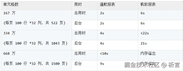 从上面的测试过程可以看出,在不断加大数据量的过程中,报表工具格间计算的性能优劣就慢慢体现出来了,而且性能衰减经常并不是线性的,数据量达到一定程度会呈现断崖式的下跌。