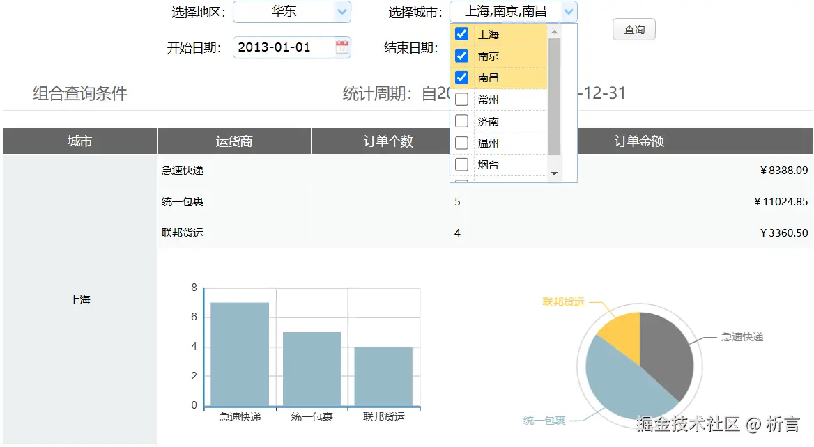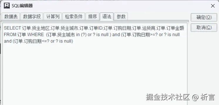 这里采用JAVA 程序执行 SQL 语句的写法,用? 做为参数的替代符,其中货主城市 in (?) or ? is null,表示如果城市参数不为空时取对应城市数据,为空时忽略掉该条件,取所有数据,写法本质上就是标准的 SQL 语句。