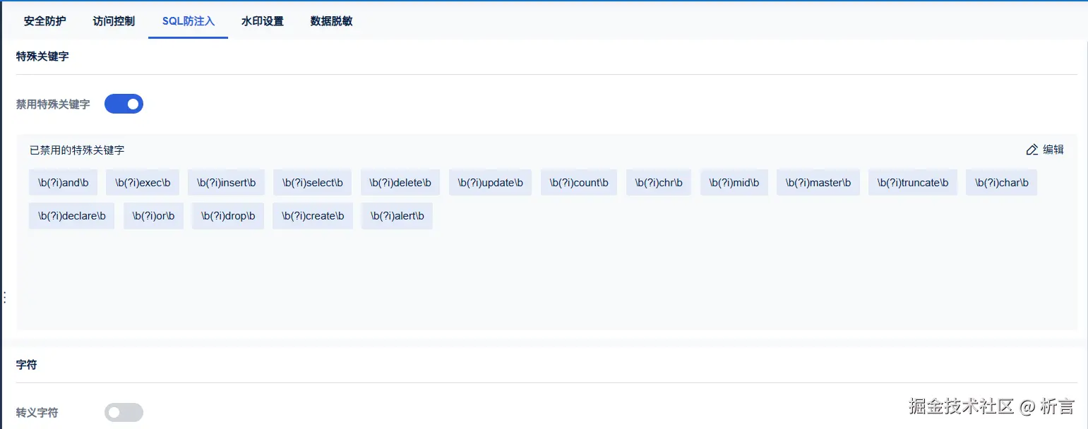 防SQL 注入漏洞,可以在帆软的数据决策系统设置禁用关键字: