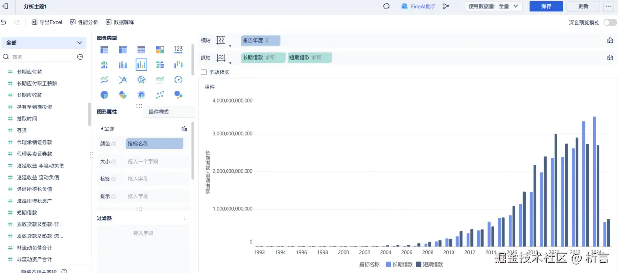 对于AI 的应用,推出了 FineChatBI,FineChatBI 是一款通过自然语言对话实现智能数据分析的工具。其核心功能是让用户直接用业务语言提问(例如“对比一下各区域本季度的销售完成率”),系统便能自动理解查询意图、生成数据查询语句,并将结果以可视化图表和文字解读的形式即时返回。用户还可以通过连续对话进行数据下钻、切换维度或图表类型,完成多轮交互式分析,最终形成分析文档报告分享给他人。