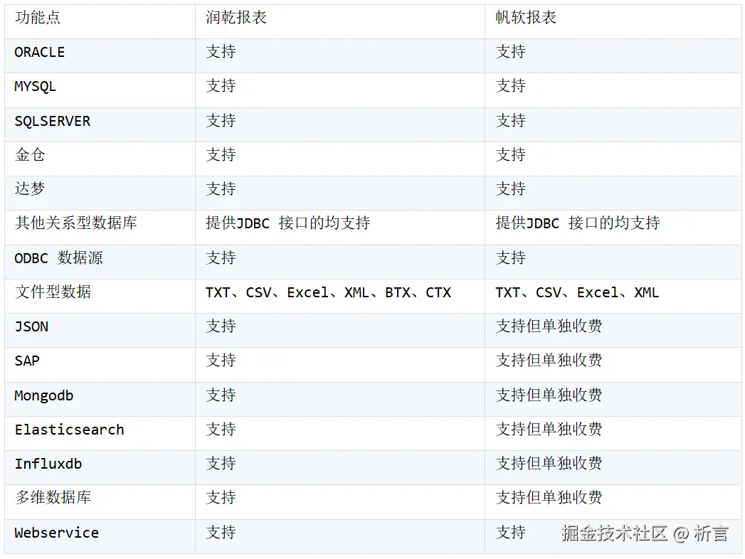 **小结:**润乾报表对于一些不常用的JDBC 驱动,需要开发人员自己去进行下载设置,需要耗费一小段时间,对于非关系型数据库的取数,主要是通过脚本数据集中的函数进行设置,有一定的学习成本。帆软报表的文档客户化做的比较完善,第三方的数据库的设置在自己官网上就能找到,而非关系型数据库中主要是通过自己插件方式 + 向导方式实现,操作起来比较容易,但是代价就是商务方面的问题。