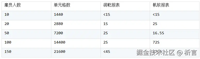 报表制作过程两款工具基本一致,具体制作就不做过多说明,通过增加雇员数量模拟不同数据量下报表工具的性能差异,测试结果如下: