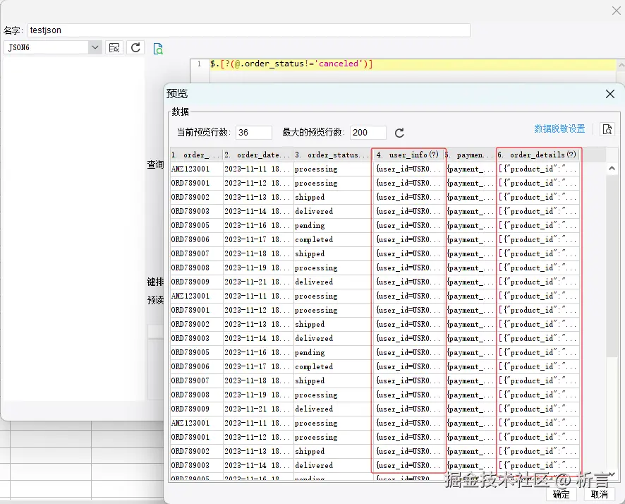 在JSON 数据集插件中,可以读取多层 JSON 数据并对数据进行过滤,但是需求中的数据分别在 user_info 和 order_details 节点内,在 JSON 插件内没法跨节点计算,所以该需求没法直接在 JSON 数据集内实现,可能还需要写代码了,这里就不写了。当然,这个需求有点复杂了,如果对于结构比较标准的 JSON 数据来说,这里通过向导来实现就非常容易。