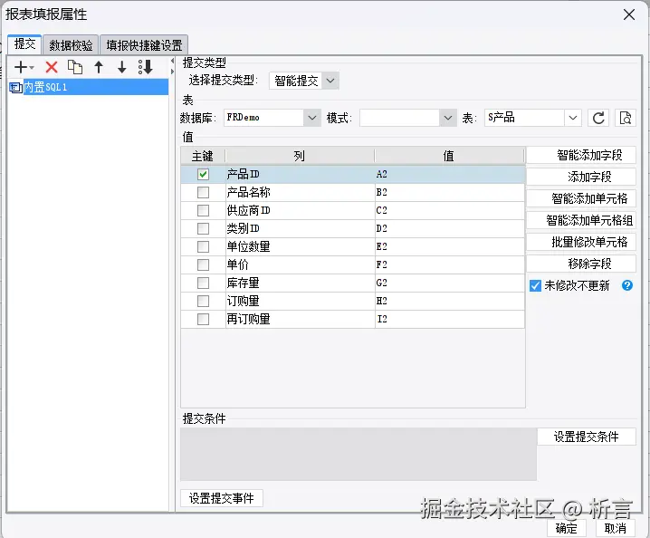 在填报属性中,用户可以直观地定义报表单元格与数据库表字段之间的映射关系。其核心设计理念是数据来去无关、多来多去,即报表数据的取数来源与填报提交的目标去向是彼此分离、独立配置的,增强了数据处理的灵活性。数据提交支持两种主要方式:一种是内置的图形化设置的SQL 方式,便于快速配置;另一种是自定义方式,允许开发者编写 Java 程序,在获取填报数据后进行复杂的业务逻辑处理。