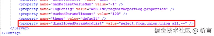 SQL 注入是最常见的数据库安全漏洞之一,数据过滤又是在 SQL 语句中加条件控制,所以参数对数据过滤时是 SQL 注入的主要入口,为了保证数据安全,可以在润乾的配置文件中加入禁用敏感词列表: