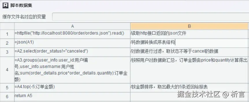 在脚本数据集中读取JSON 数据,可以对数据做过滤、运算、排序等设置,使得原来要到报表里的一些操作直接在取数阶段完成,报表模版就很简单了: