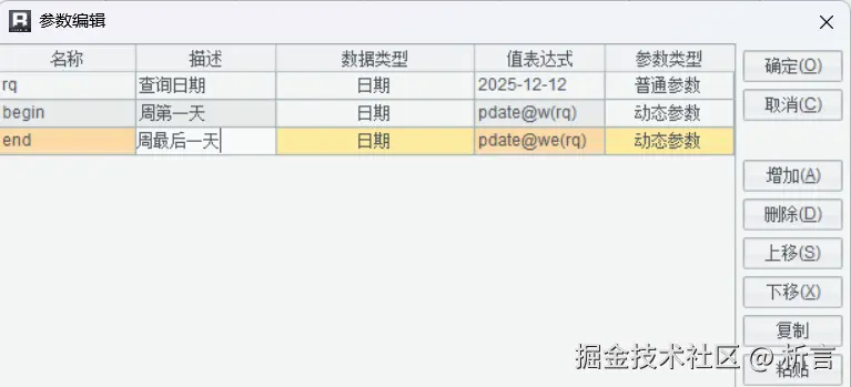 润乾报表参数类型分为普通参数和动态参数,普通参数主要用于接收外部系统或者参数面板传入参数的值,动态参数内可以设置润乾表达式,比如做周报表时,可以定义一个日期参数接收传入的日期,再定义两个动态参数取该日期所在周的第一天和最后一天: