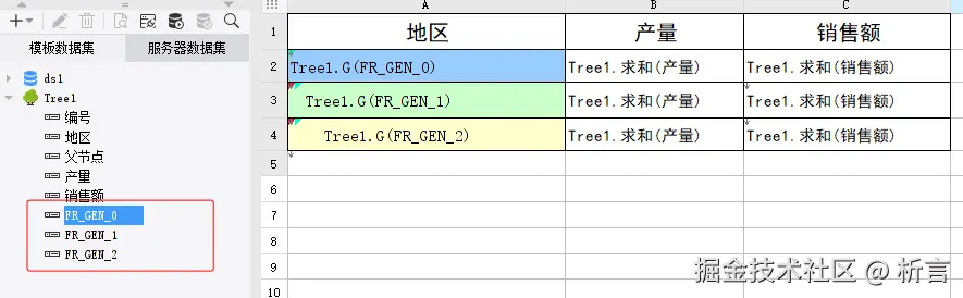 数据中有三个层级,这里会自动增加三个字段存储不同层级信息,制作报表模版如上图,有几个层级报表中增加几行,然后设置左主格方式达到跟随扩展的目的。