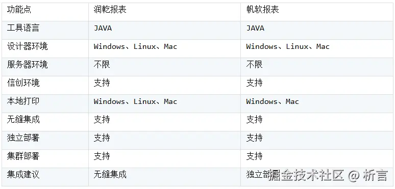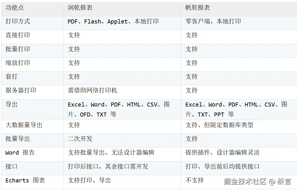 **小结:**打印导出做为报表工具的基础功能,润乾报表与帆软报表核心功能相近,细节区别主要在于导出的一些文件格式,润乾报表支持OFD,帆软报表支持导出 PPT。帆软报表提供了更多的接口来实现特殊业务处理,润乾报表在大数据量打印及导出方面提供了更优的解决方案。