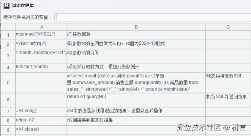 相比之下,润乾报表在数据集层面更倾向于提供统一而灵活的技术实现。主要依托脚本数据集,使用内置的SPL 语法或相关函数,将复杂的数据准备、转换与计算过程通过脚本实现。这种方式虽然对开发人员的技术水平以及学习能力有一定要求,但也因此带来了更强的扩展能力和处理自由度,能够应对结构复杂、逻辑多变的报表场景。