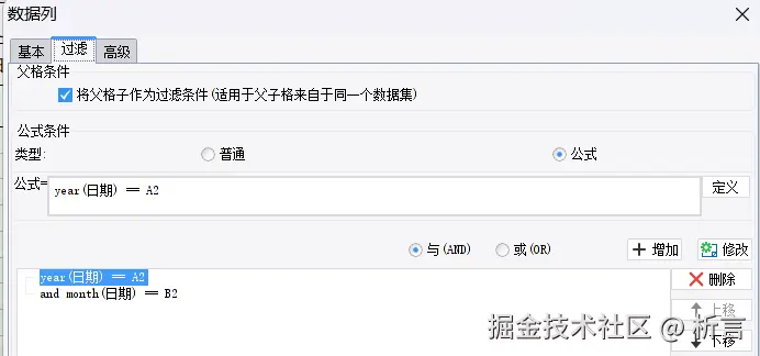 这种向导方式对初学者比较友好,多个条件看起来逻辑比较好区分,但是如果再需要修改公式,也同样要通过这个向导页面来操作,操作上反而有点麻烦。