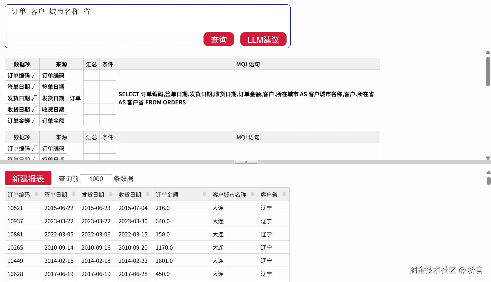 此外,润乾BI 的 DQL 和 NLQ(自然语言查询),进一步强化了数据查询的灵活性,NLQ 支持通过自然语言描述(如 “每年各股票,最大月连涨天数”)自动生成查询逻辑,降低了查询操作的技术门槛,LLM 接入了 DeepSeek,协助生成更精准的 NLQ 语句,提升了BI 使用的便捷性,并且由于借助了 DQL 模型,查询时是可以直接做跨表查询的: