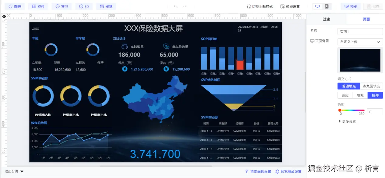 而润乾报表在组件布局方面仍延续了较为传统的设计模式,对细节的调整过程相对繁琐。此外,若要实现理想的图表展示效果,通常还需配合Echarts 等第三方图表进行细致调试,整体开发精力易耗费在样式与布局的细节调优上。其工具中未直接提供常用的布局模板,用户往往需要从零开始逐一配置组件与样式,因此在可视化界面构建效率上相对较低,耗时较多。