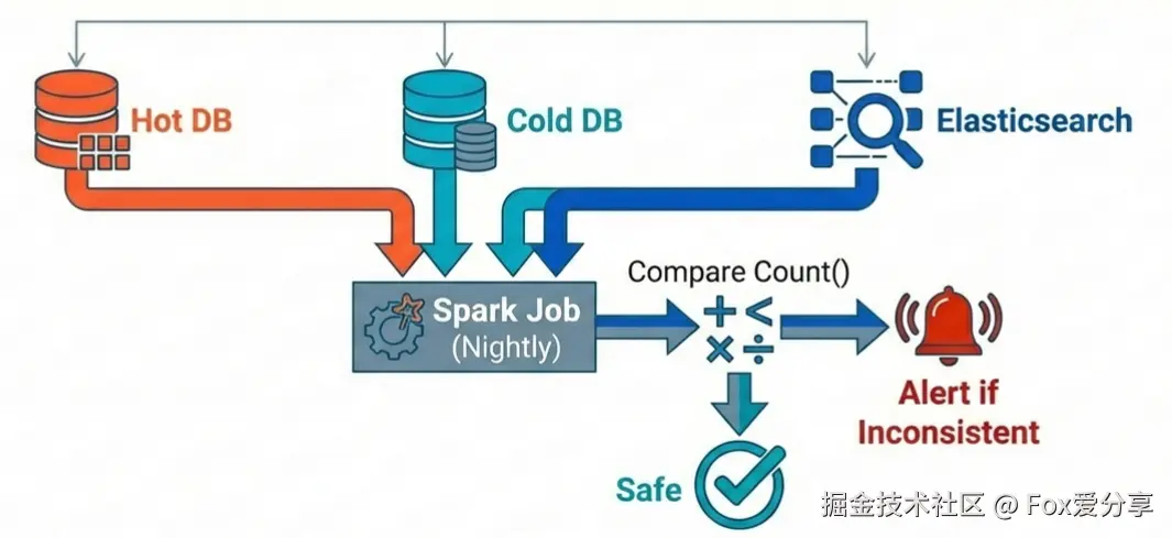 archive_status,归档成功后再改状态,最后清理。 - 离线核对: 每天凌晨跑个 Spark 任务,对比热库、冷库、ES 三方的数据 Count 值。