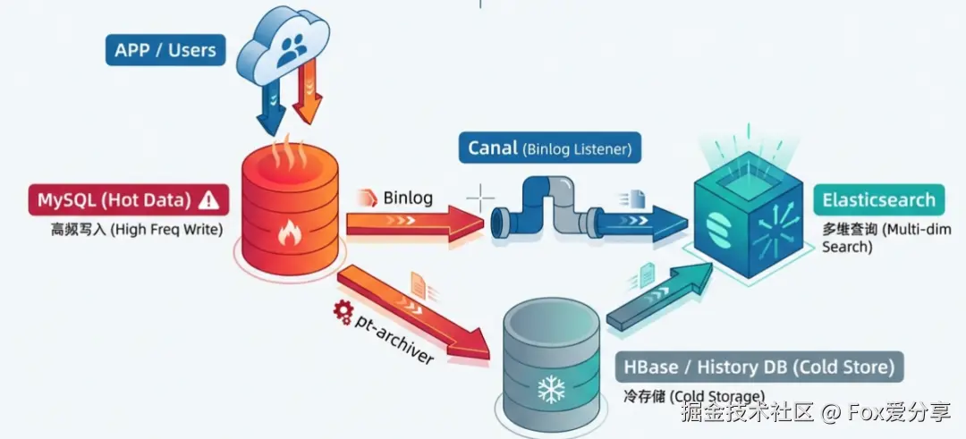 - 方案细节: 每天凌晨,每秒只挪动 500 条数据到冷库/HBase。这种“蚕食”方式,主从无感,磁盘 IO 几乎没波动。热表始终控制在 500 万行的“轻量”状态,索引全在内存里。