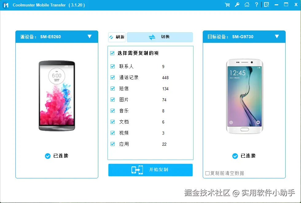 03 您可以选择要复制的数据类型,例如联系人、消息、照片、视频等。之后,点击 “开始复制” 即可开始复制。
