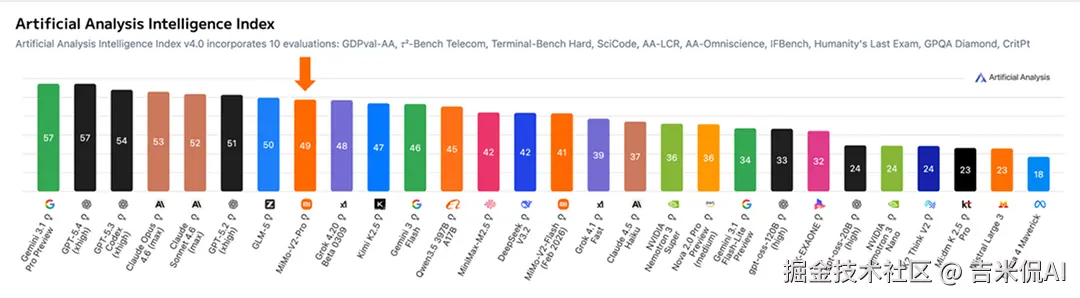 在全球权威榜单Artificial Analysis上,MiMo-V2-Pro目前位列全球第八,国内第二。