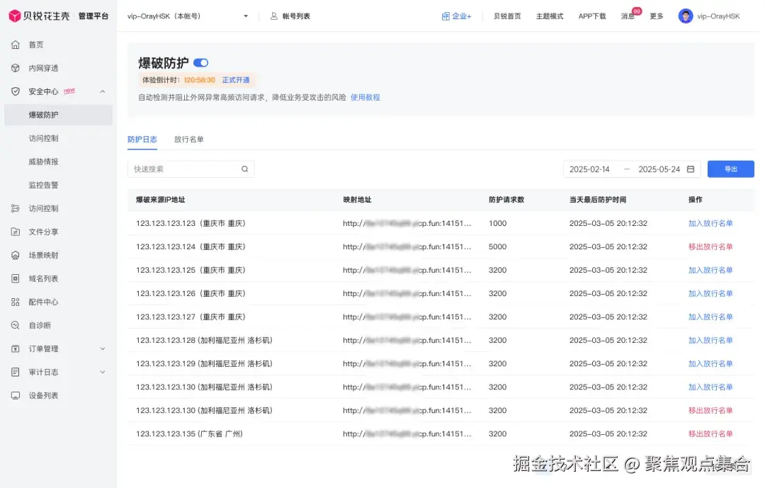 爆破防护能力:自动检测并阻止外网异常高频访问请求,降低业务受攻击的风险,同时轻松管理允许和禁止访问的外网地址,确保业务安全性与连续性。
