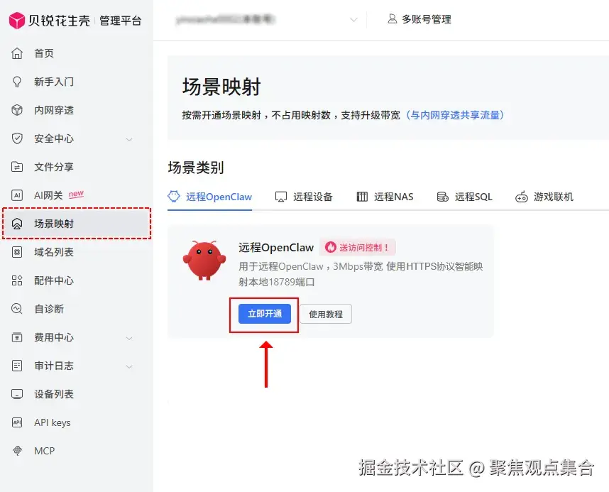 2.登录花生壳管理平台 ,进入【场景映射】页面,根据提示开通“OpenClaw映射”场景映射或直接点击下图。