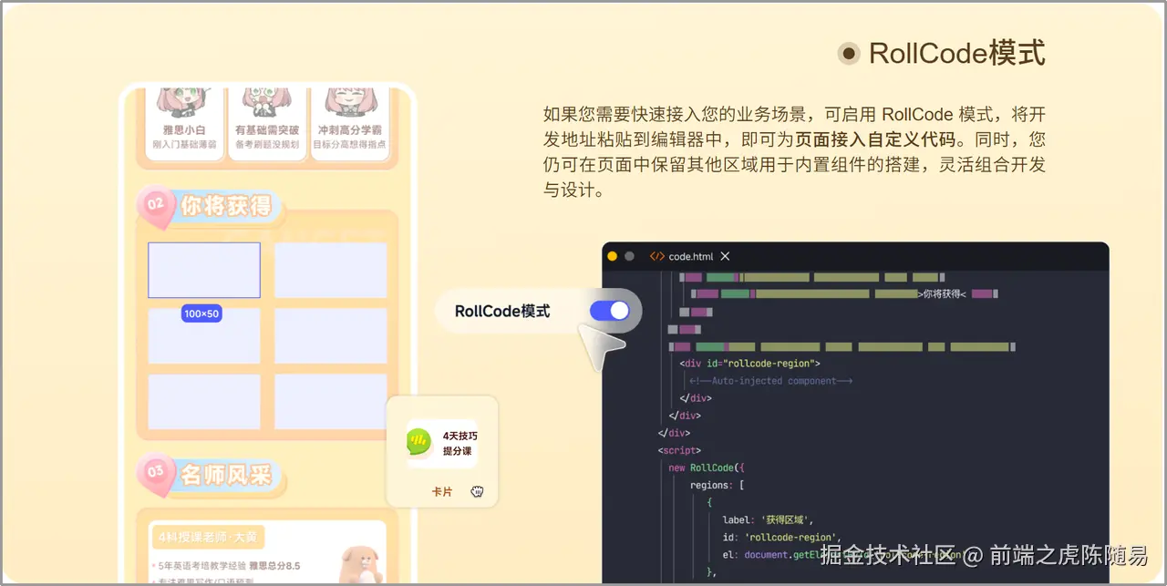 我看 RollCode 时,最先注意到的就是它对这个痛点的处理思路。它不是那种一上来就喊着“以后都不用程序员了”的工具,恰恰相反,它更像是在帮开发把一部分高频、重复、机械的页面工作交出去,让团队里做内容、做视觉、做活动的人,也能承担起原本压在开发身上的那部分页面修改工作。