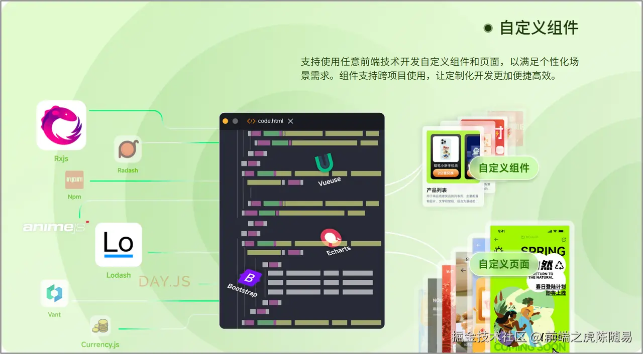 但我之所以对它印象还不错,不是因为它能拖拽,而是因为它没有把“拖拽”神化成万能答案。做过项目的人都知道,真正难的地方不在页面排版,而在复杂逻辑、定制功能、特殊交互和已有系统对接。也就是说,一个工具如果只能做简单的展示页,那它最多是个快速出图器;可一旦能让开发通过自定义组件、自定义页面、甚至接入现有代码去补足复杂能力,它就从“玩具”开始接近“生产工具”了。