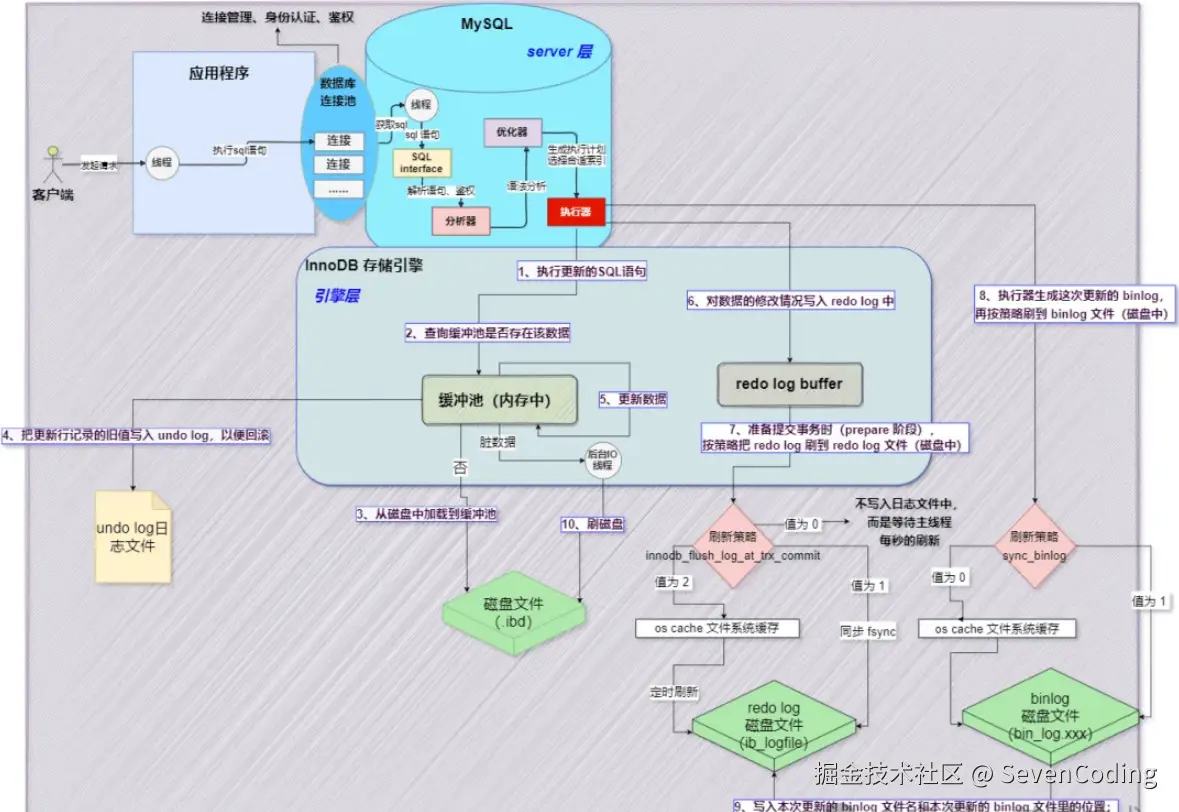 对于涉及数据修改的 SQL(如 INSERT、UPDATE、DELETE 等),执行器还需要管理事务的提交和回滚操作,确保数据的一致性和持久性。这些操作会与 MySQL 的日志系统(Undo Log、Redo Log、Binlog) 密切交互,确保事务的 ACID 属性。