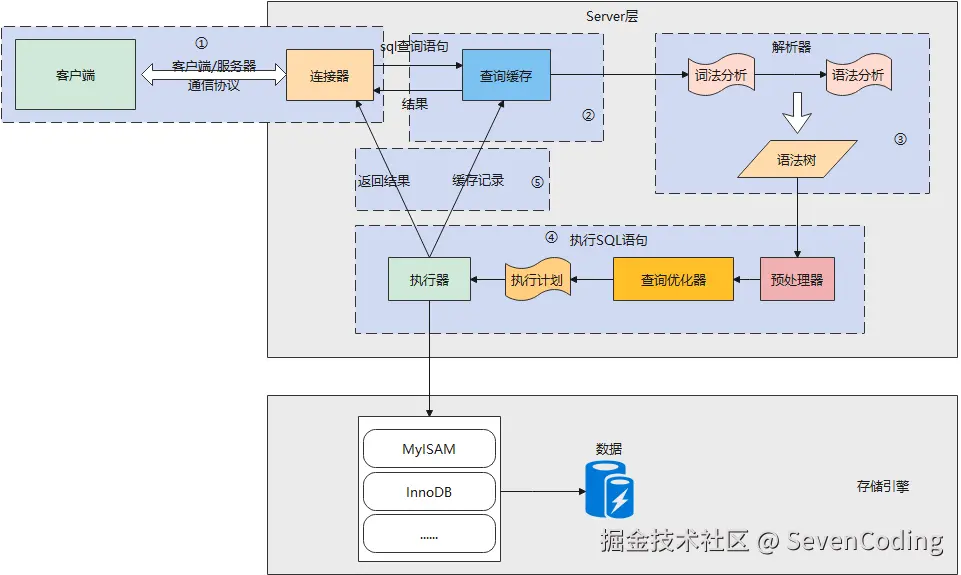 - 查询缓存:查询语句如果命中查询缓存则直接返回,否则继续往下执行。MySQL 8.0 已删除该模块;
