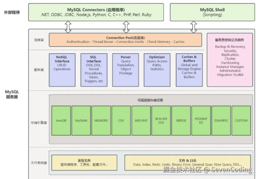 - 文件系统层:这一层主要包括日志文件、数据文件及与 MySQL 相关的其他程序。在这四个层次中,服务层和存储引擎层构成了架构的核心。服务层负责处理 MySQL 的核心逻辑,而存储引擎层则直接负责数据的存取操作。