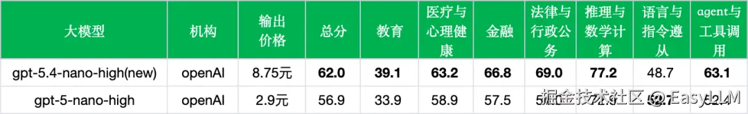 - Agent与工具调用提升显著:从52.4%提升至63.1%(+10.7%),这与gpt-5.4-nano-high作为子智能体的核心定位高度吻合——在多模型工作流中承担工具调用和任务执行的角色,这一能力的提升具有直接的应用价值。