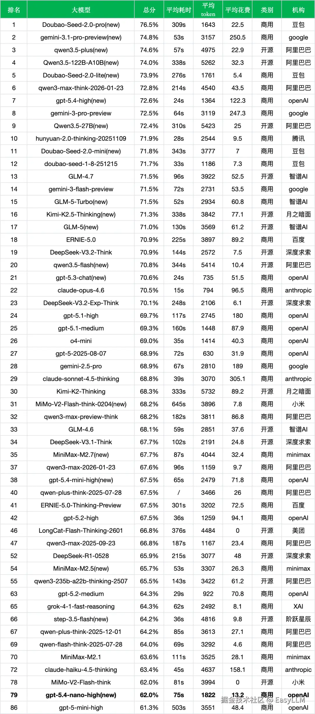 - 闭源阵营中的入门选手:gpt-5.4-nano-high在闭源模型中准确率处于中下游,在62%左右的区间内,与MiMo-V2-Flash-think(62.0%,第78位)基本持平。