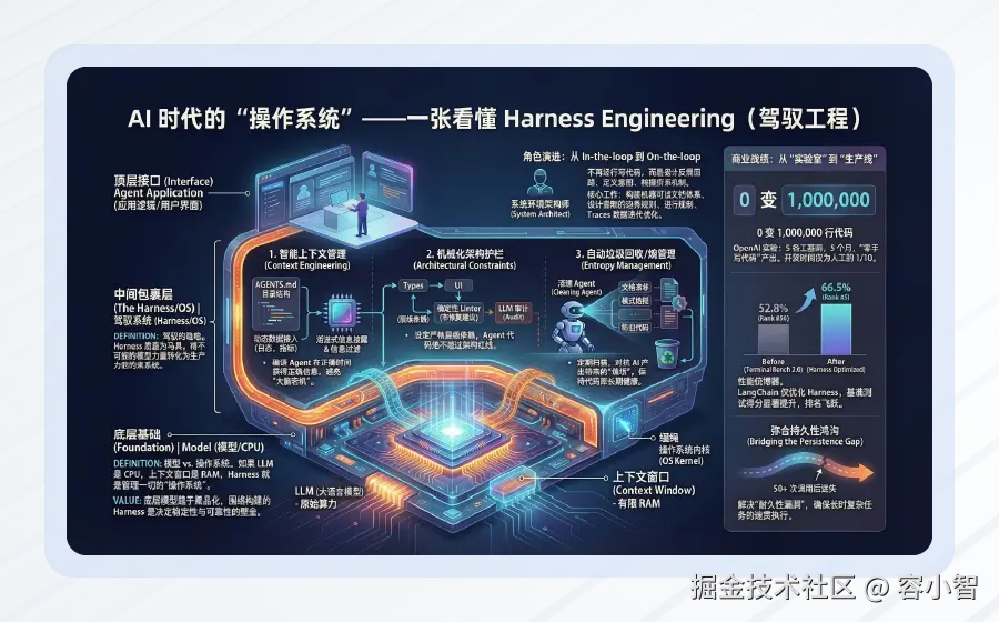 今天,我们就来科普这套改写AI应用逻辑的核心——驾驭工程(Harness Engineering),看看它如何让AI从“智商超群”蜕变为“靠谱得力”的数字员工。