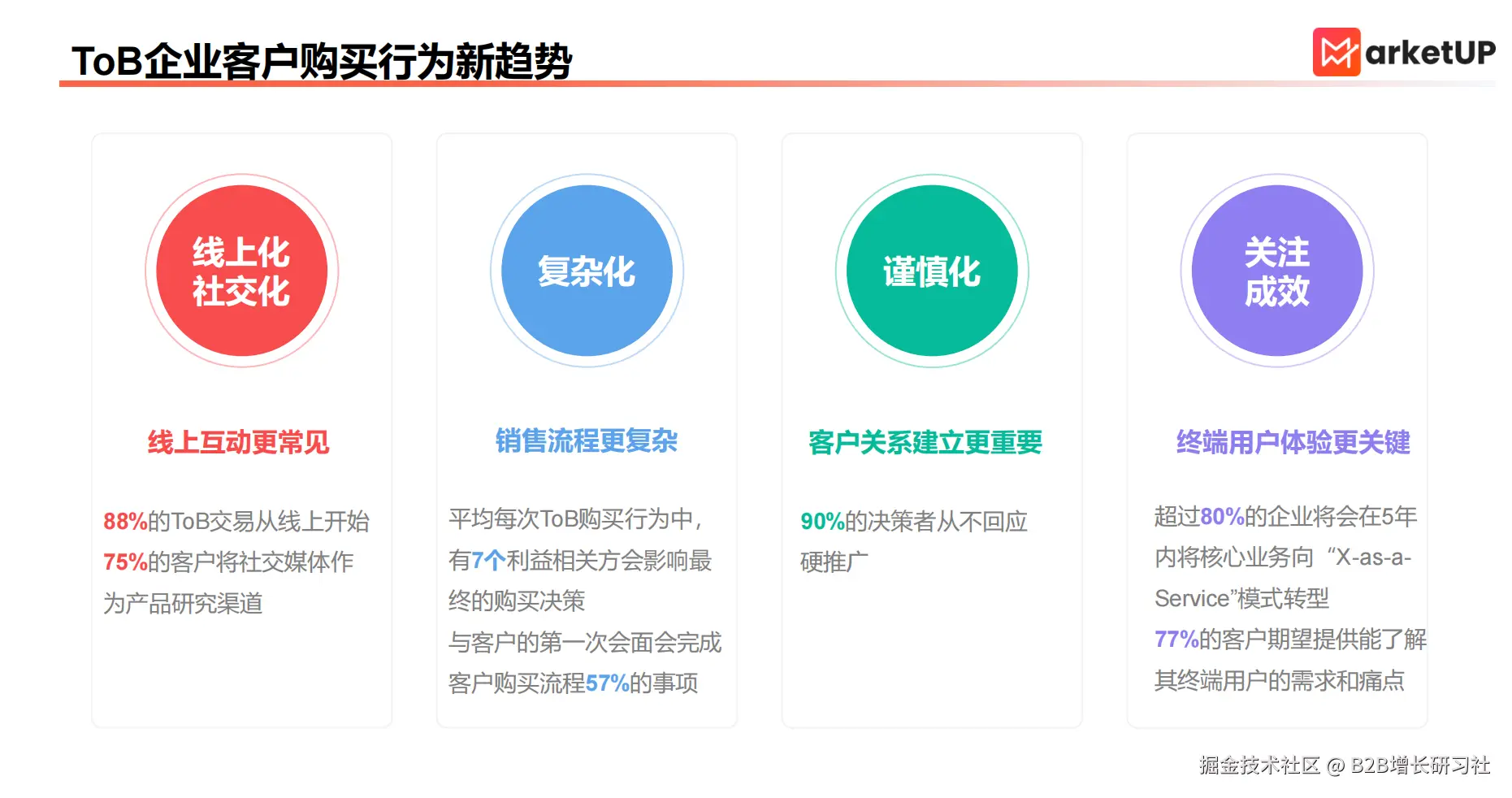 在当前的B2B市场环境中,客户的购买行为正在发生显著变化,呈现出线上化、社交化、复杂化和谨慎化的新趋势 。定期的营销效果评估可以帮助企业应对以下挑战: