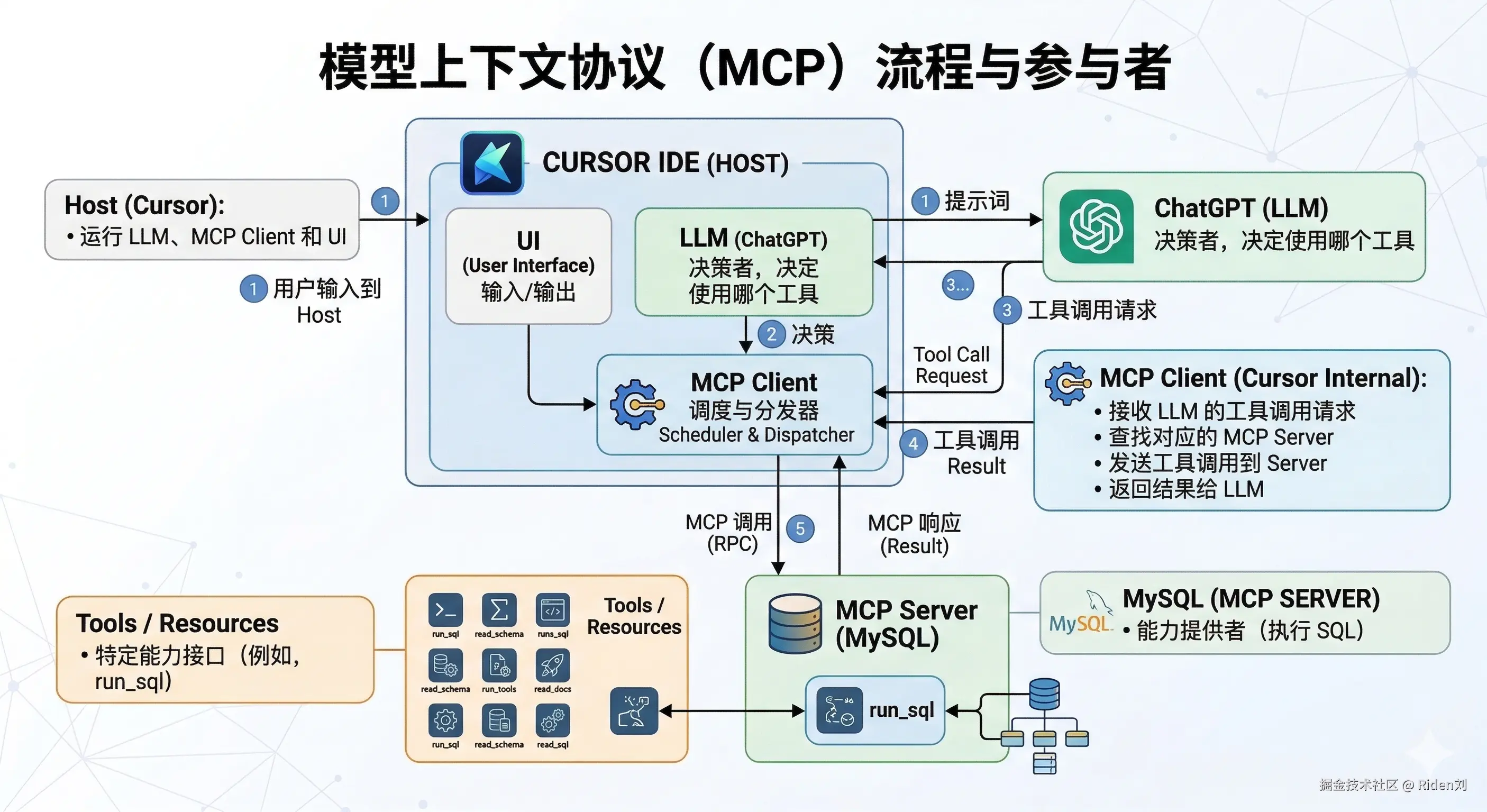 - Host(Cursor) :运行 LLM + MCP Client + UI