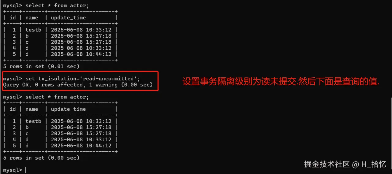 1.1:打开一个客户端A.设置当前事务级别为read uncommittied(读未提交).