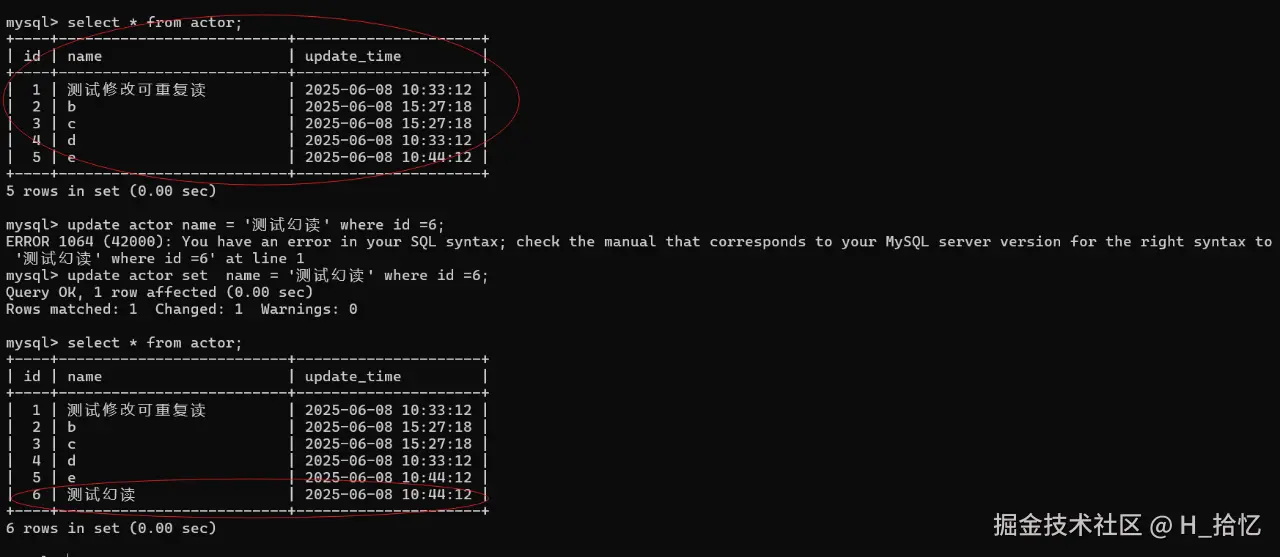 打开客户端B重新开启事务,然后插入一条数据.客户端A进行查询,不会看到.做到了可重复读,当执行完修改语句,在进行查询,那条语句就像幻觉一样出现了.串行化就是为了解决幻读.