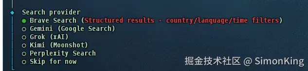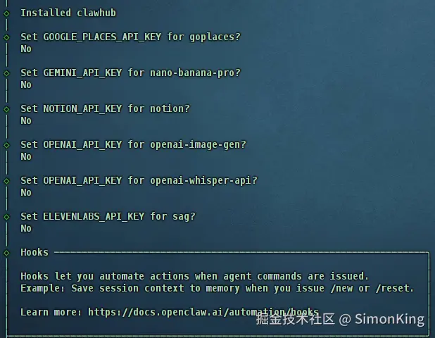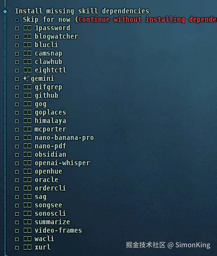 用来安装缺失或者其他的技能,就是一个skills的应用市场。我们选择官方的clawhub。通过方向键切换,空格选中,回车确认。可以多选。
